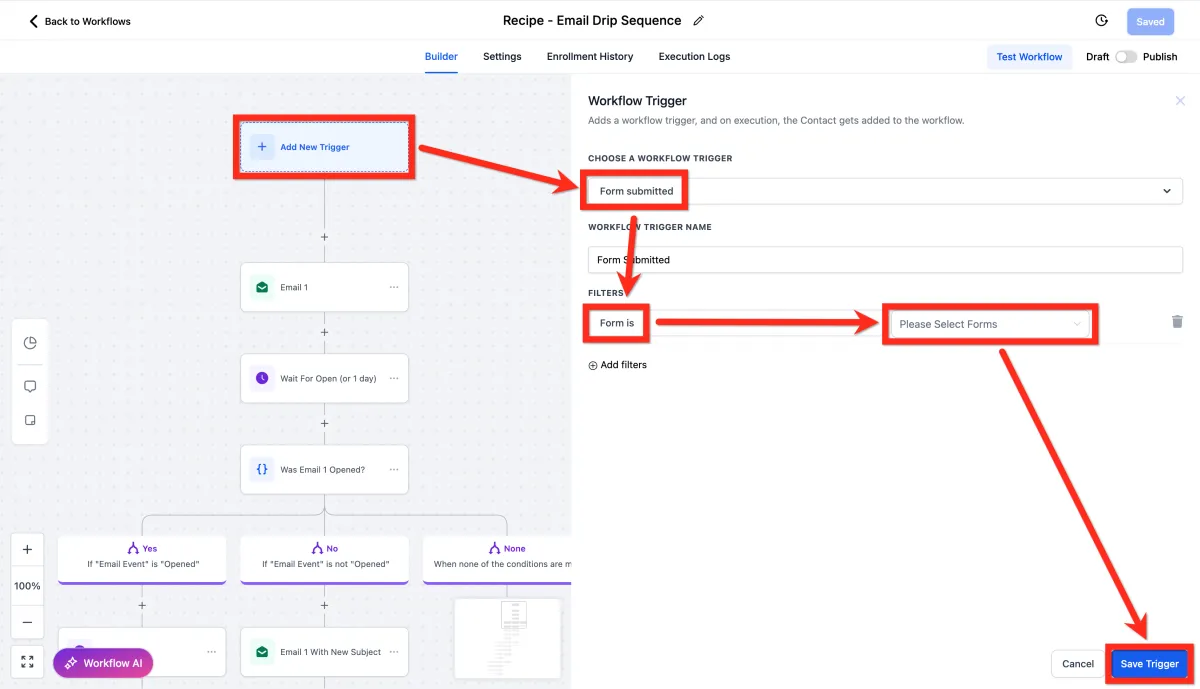 Add the trigger Form Submitted: Click Add filter, choose Form is, select the desired form, and click Save.