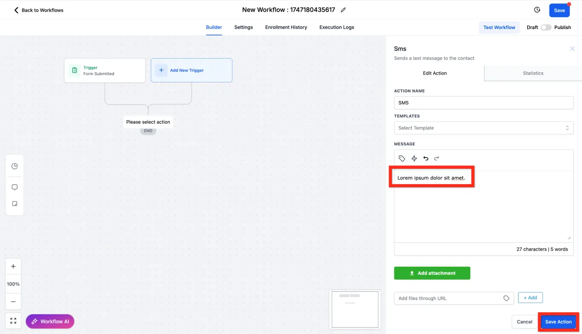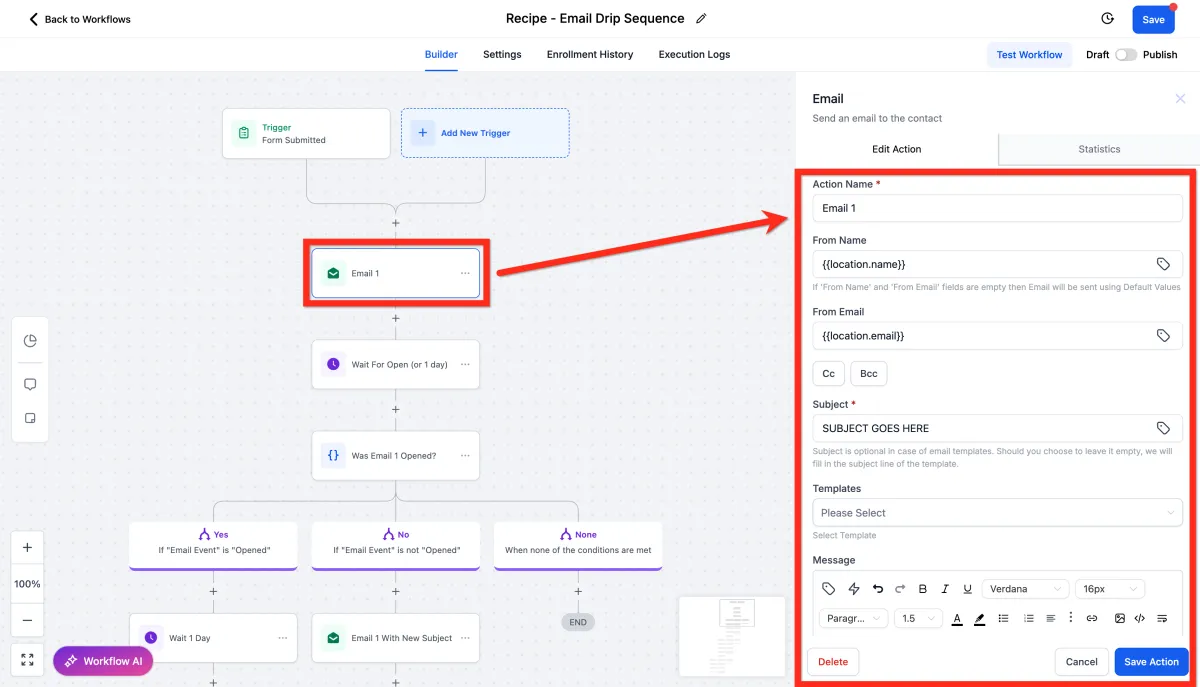 Edit the email actions by customizing the subject, message content, attachments, and other details. Then click Save Action.