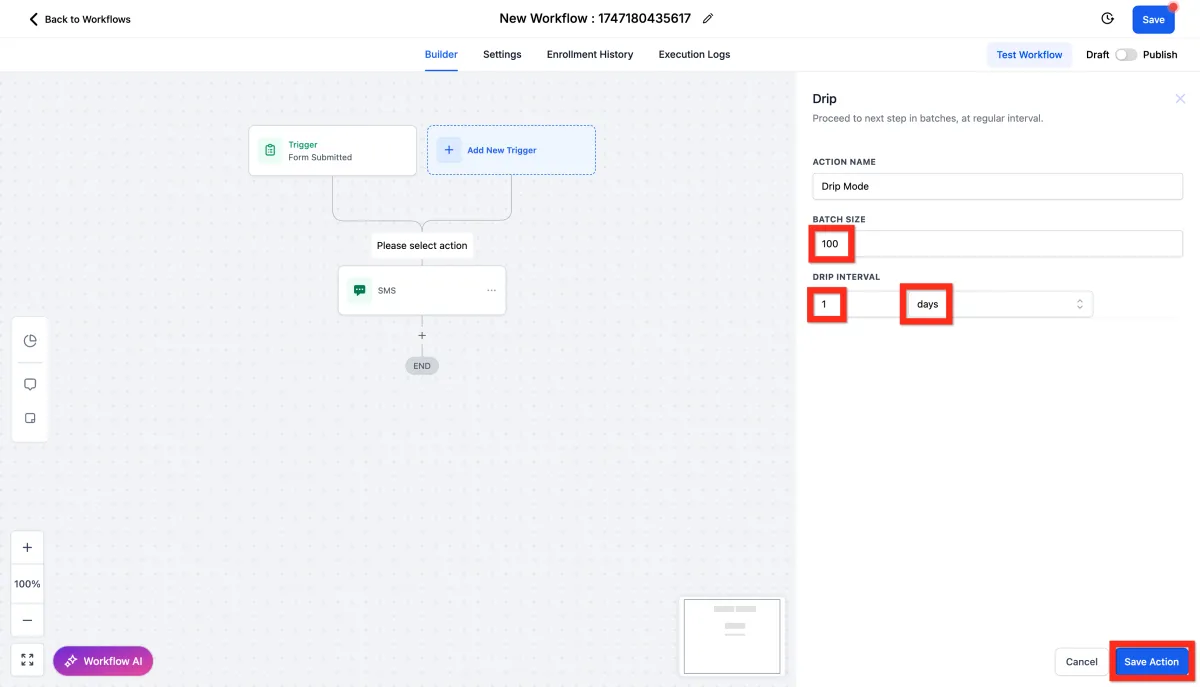 Set your batch size to 100. Choose the drip interval as every 1 day. Click Save Action.
