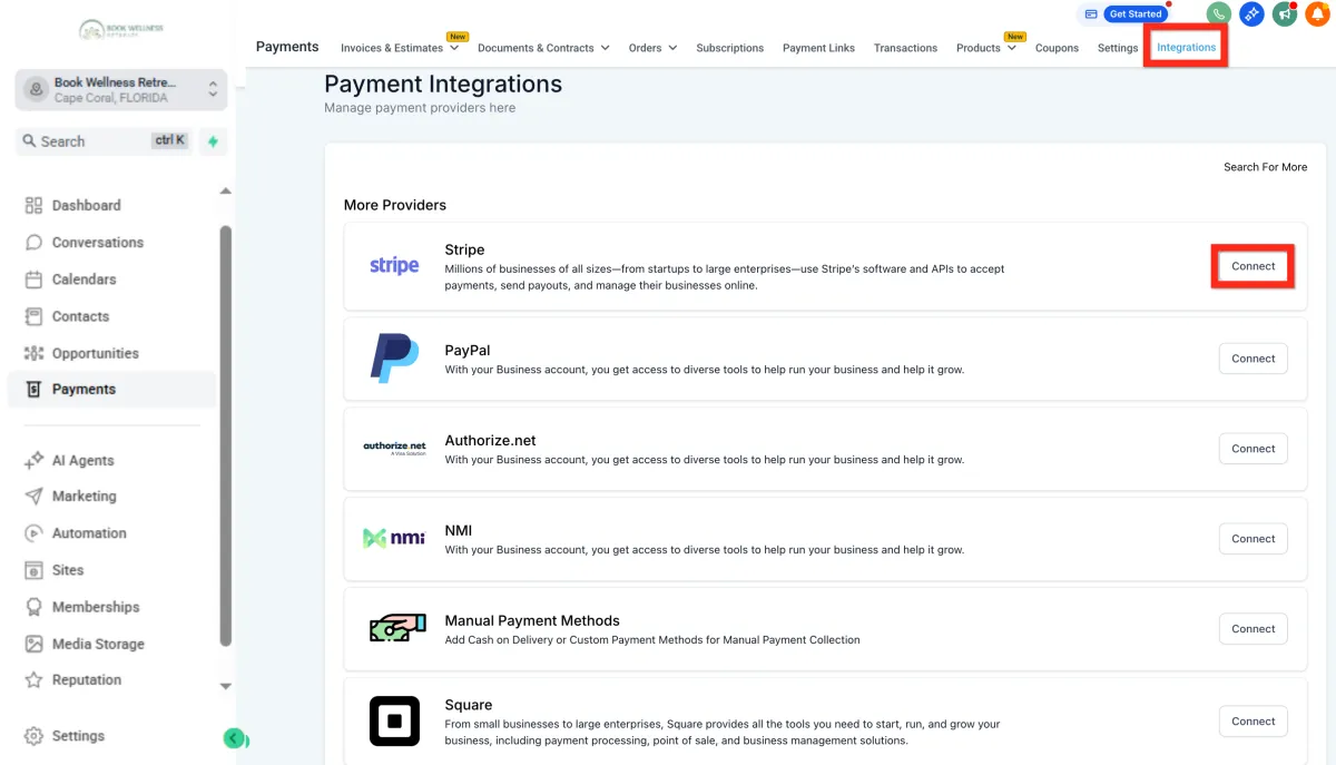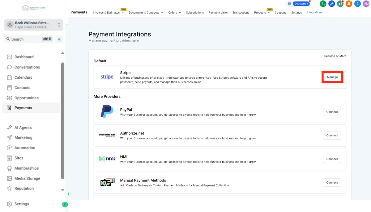 Navigate to Payments > Integrations. Here, you'll find popular options like Stripe, PayPal, Authorize.net, NMI, Manual Payment Methods (ex: cash on delivery, COD), and Square.