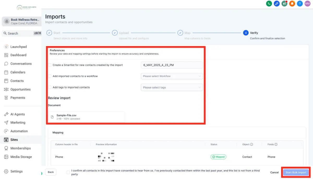 7. Fill in the import details (name your import, create lists, set consent preferences, etc.) and click Bulk Import.