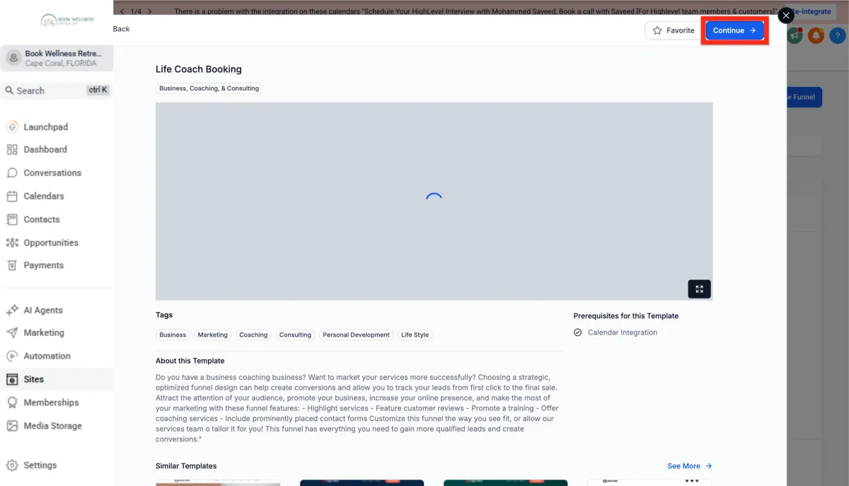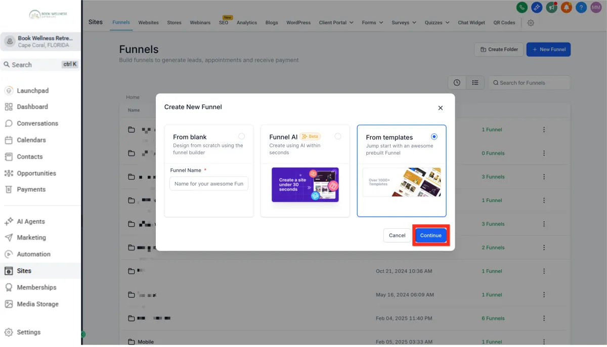 Click New Funnel > From Template > Continue