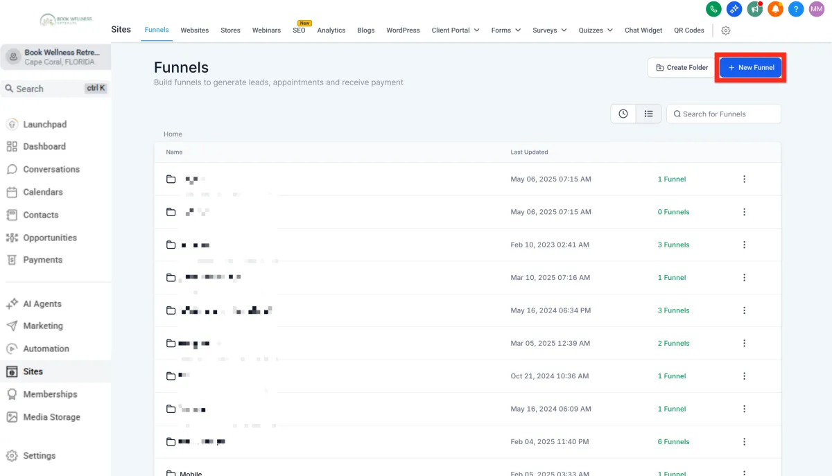Navigate to Sites > Funnels.