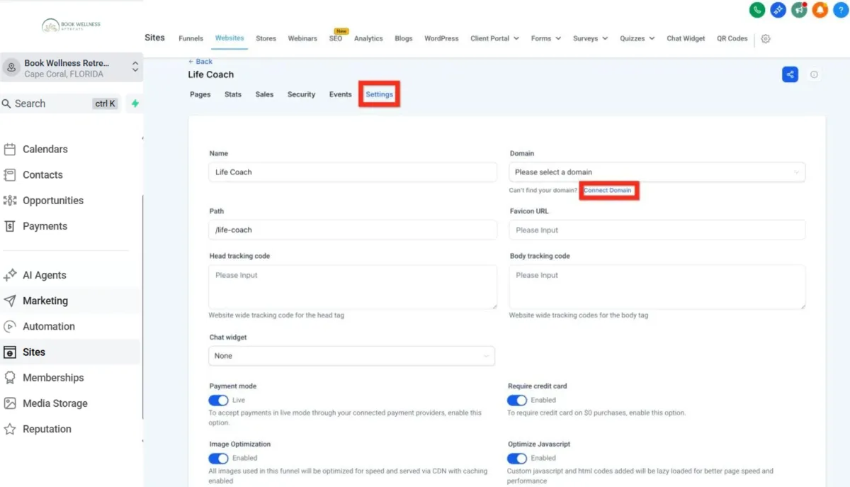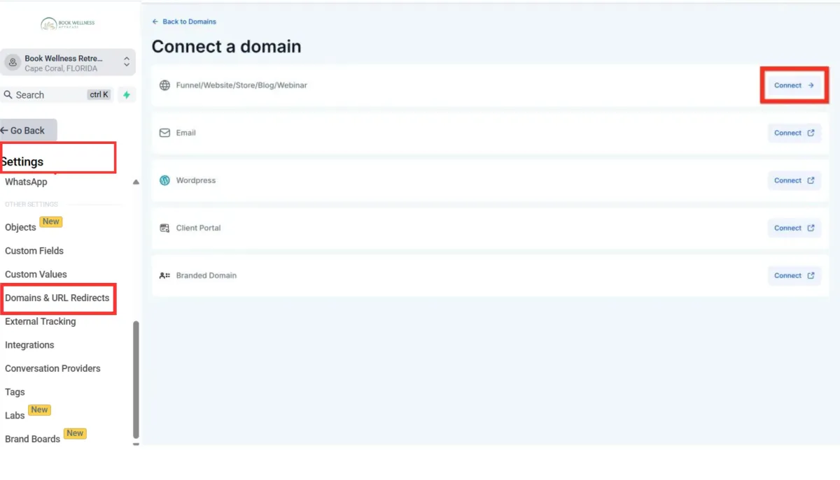 Click to connect a website: Use the option for blog/funnel/website/etc.