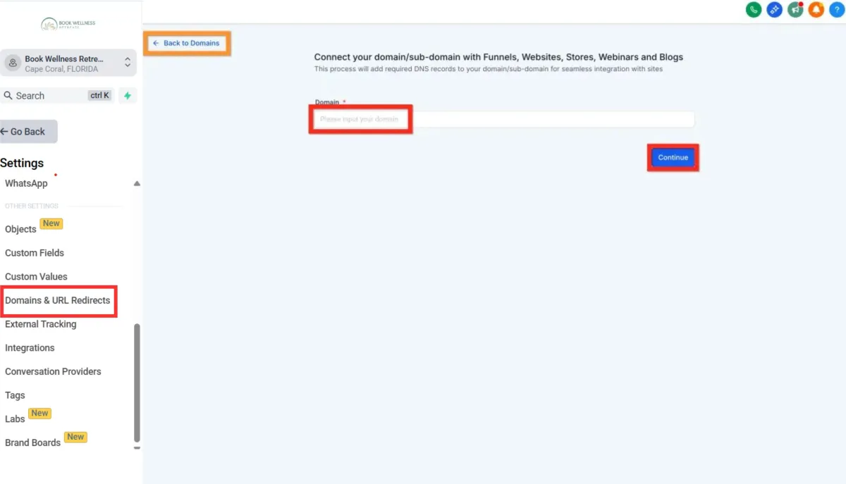 After clicking Connect Domain you might go straight to this page, in which cast you can enter your domain and click Continue, or you can click Back to Domains to go to the Settings > Domains list of domains.