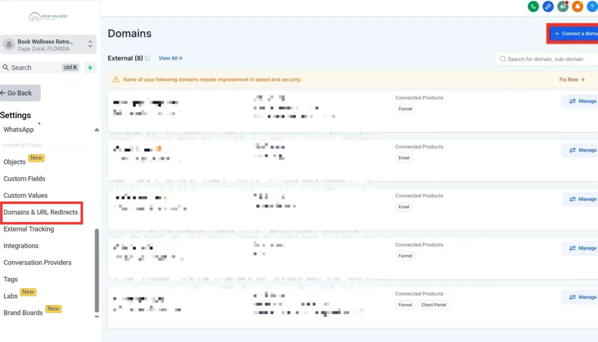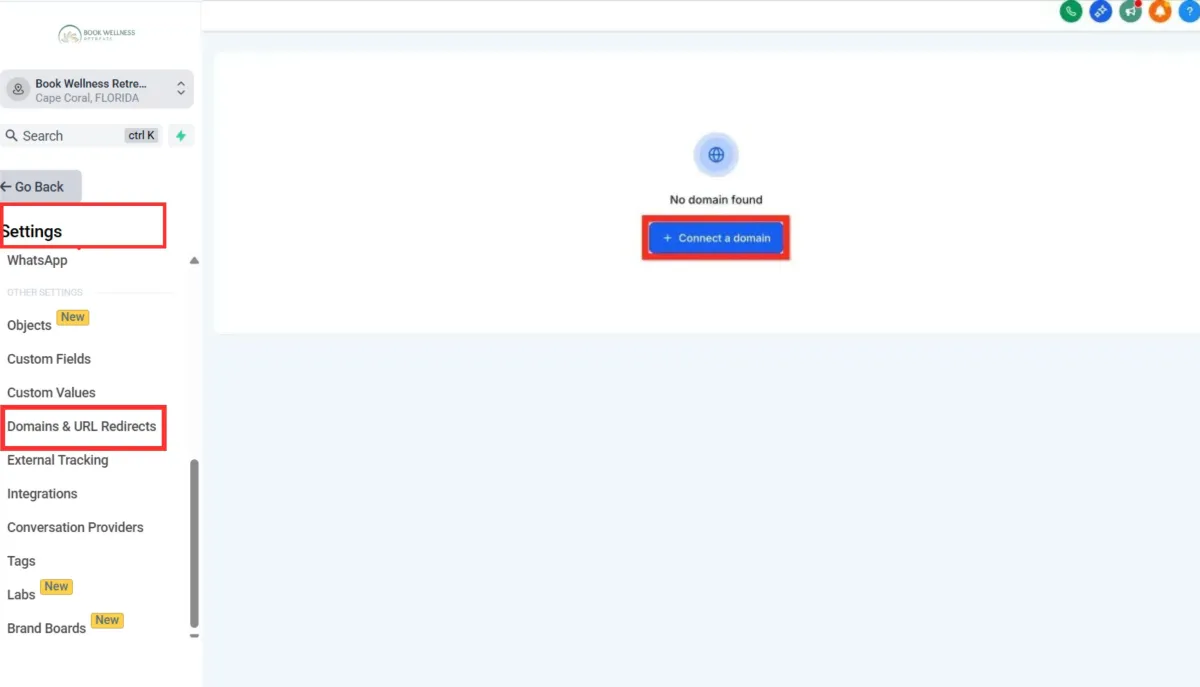 Under Domain Click Connect Domain: Find the domain dropdown and click the Connect Domain link underneath.