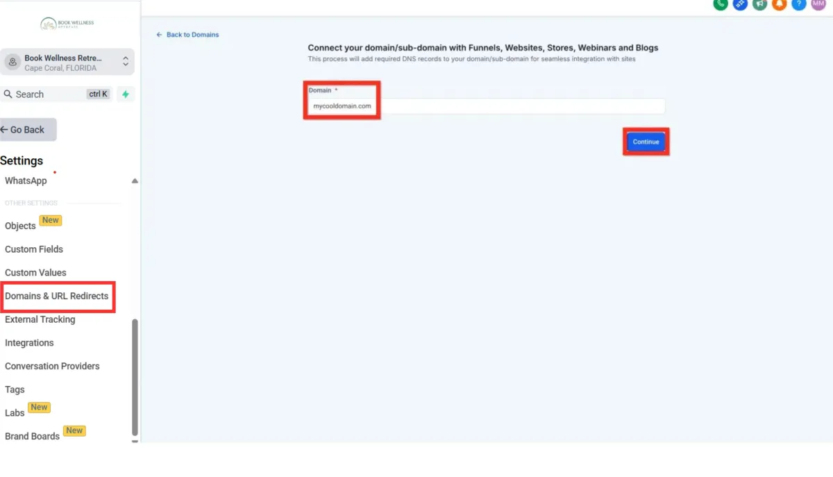 Enter the domain and click Continue: This is where you specify the domain you want your website to launch on.
