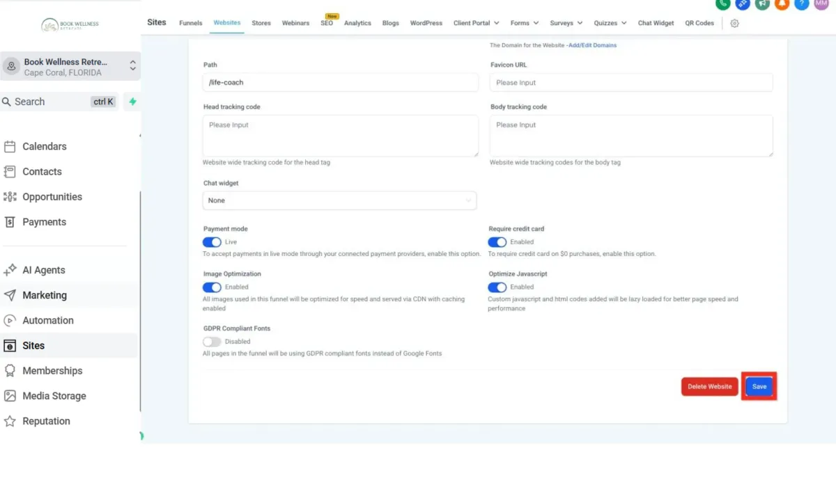 Navigate back to Website Settings Tab: Return to settings one last time.