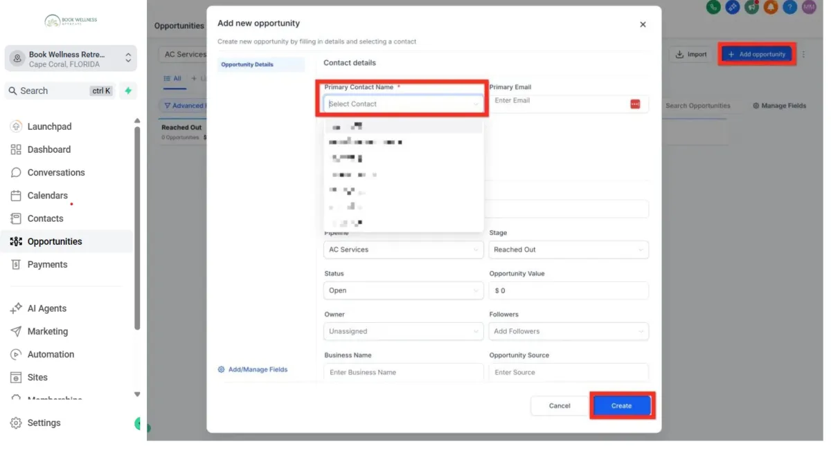 Fill in the Opportunity details (pipeline name, stage, value, etc.).