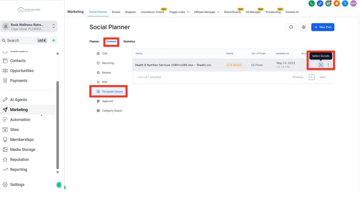 Schedule your selected template by clicking Select Socials (the plus icon on the right).