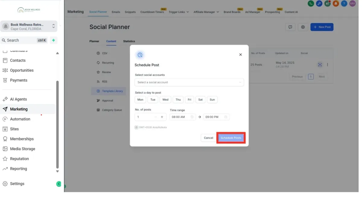 Fill out the necessary details in the Schedule Post modal, including your Facebook account and timing.
