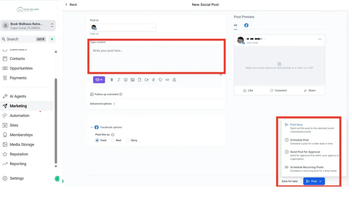 Choose to save for later, post now, schedule for later, send for approval, or schedule as recurring.